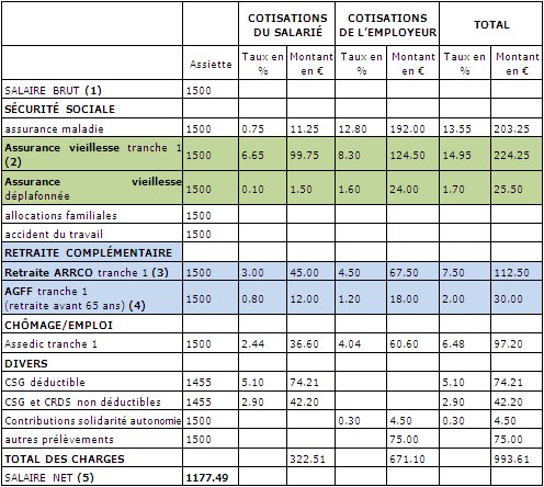 (Nota concernant vos cotisations pour votre retraite sur vos fiches de paie : il n'existe pas un modèle standard de fiche de paie, mais l'employeur est tenu d'y faire figurer certaines données (comme de s'abstenir d'en mentionner certaines autres) et les cotisations pour la retraite (de base et complémentaire) en font partie. Voir une fiche de paie à titre d'exemple ci-dessous :