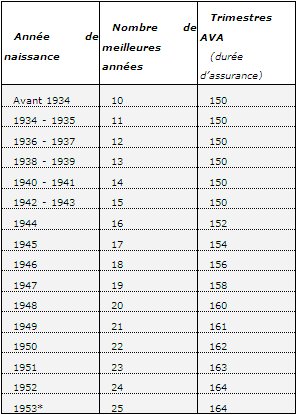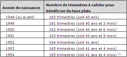 2.7 Durée de référenceComme pour tous les régimes, c'est le nombre de trimestres requis pour le bénéfice du taux plein. Ce nombre de trimestres était de 160 avant la réforme des retraites de novembre 2010. Celle-ci a prévu de le porter à 165 en 2018, soit 41 ans et 4 mois, avec des paliers intermédiaires selon les âges de naissance. Toujours dans l'optique d'une modification progressive, le nombre requis variera en fonction de l'année de naissance de l'assuré, dans les conditions précisées dans le tableau suivant :