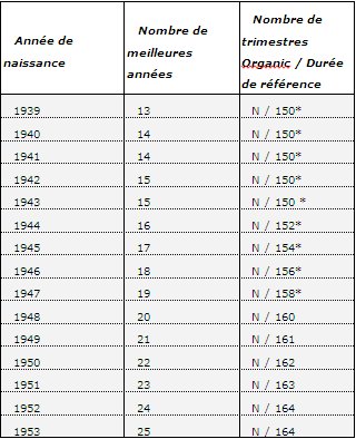 - Les chiffres figurant dans le tableau sont valables si la prise d'effet de la pension est antérieure au 1er janvier 2008. Pour les pensions prenant effet à compter du 1er janvier 2008 et postérieurement, la durée de référence appliquée à la pension des assurés nés en 1947 et antérieurement sera de 160