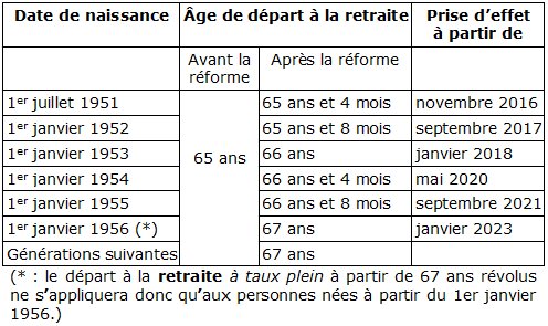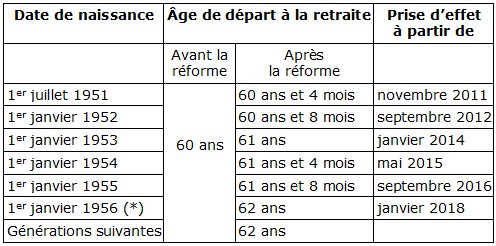 (* : le départ à la retraite à partir de 62 ans révolus ne s'appliquera donc qu'aux personnes nées à partir du 1er janvier 1956.)