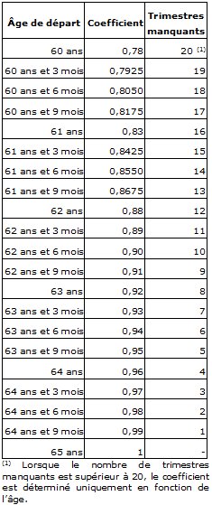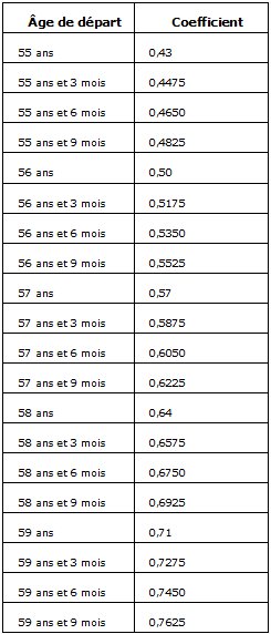 L'âge légal de départ en retraite étant de 62 ans, cette disposition signifie que la retraite complémentaire est minorée par un coefficient dit d'anticipation et cela de manière définitive dans la plupart des cas. Voir ci-dessous le tableau des coefficients de minoration selon les âges :