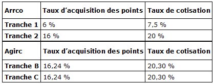 Le Taux de cotisation est égal au Taux d'acquisition d'un point que multiplie le Taux d'appel. Le taux d'appel est égal à 125 %. Il a été mis en place afin d'équilibrer les régimes de retraite ARRCO et AGIRC. Le taux d'acquisition dans chaque tranche des 2 régimes est précisé dans le tableau ci-dessous :